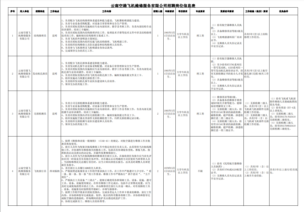 本次招聘共涉及結(jié)構(gòu)修理員(1名)、發(fā)動(dòng)機(jī)孔探員(1名)、無(wú)損檢測(cè)員(2名)、飛機(jī)放行員(2名),共4個(gè)崗位,需求人數(shù)6人,具體詳見(jiàn)附件《云南空港飛機(jī)維修服務(wù)有限公司招聘崗位信息表》。