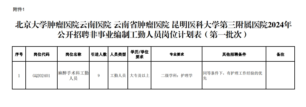 附件1:北京大學(xué)腫瘤醫(yī)院云南醫(yī)院 云南省腫瘤醫(yī)院 昆明醫(yī)科大學(xué)第三附屬醫(yī)院2024年非事業(yè)編制工勤人員崗位計(jì)劃表(第一批次)