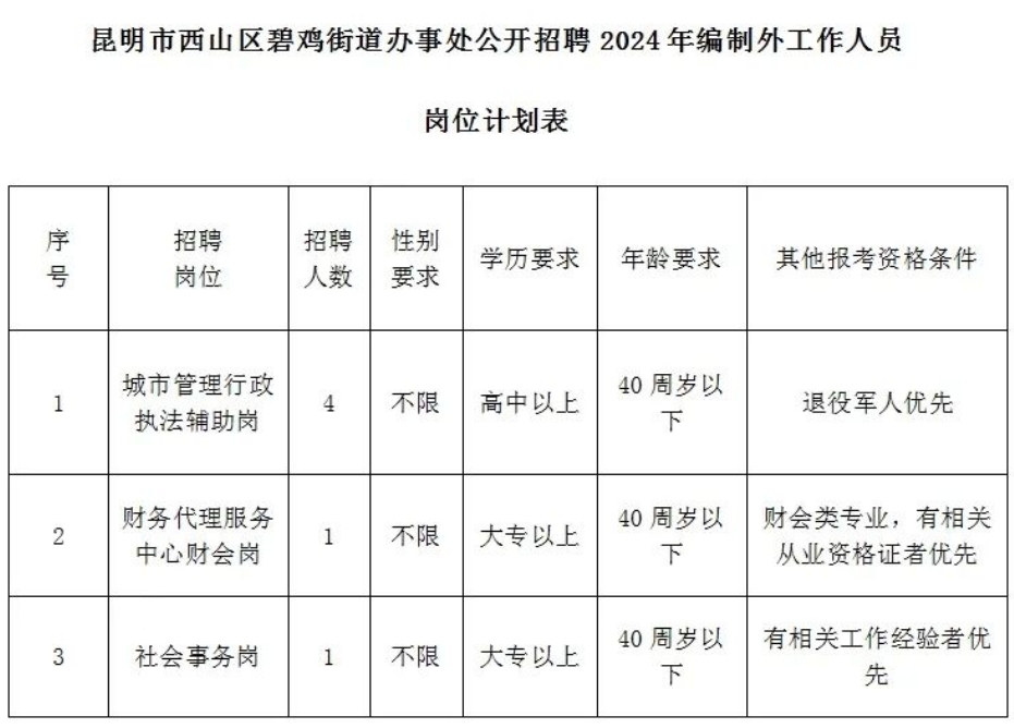 一、此次面向社會公開招聘昆明市西山區(qū)碧雞街道辦事處城市管理行政執(zhí)法輔助崗4名、財務(wù)代理服務(wù)中心財會崗1名、社會事務(wù)崗1名,共計6人(性別不限)