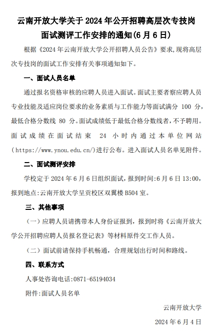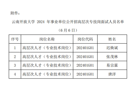 2024年云南開放大學(xué)招聘高層次專技崗面試測(cè)評(píng)通知(6月6日)