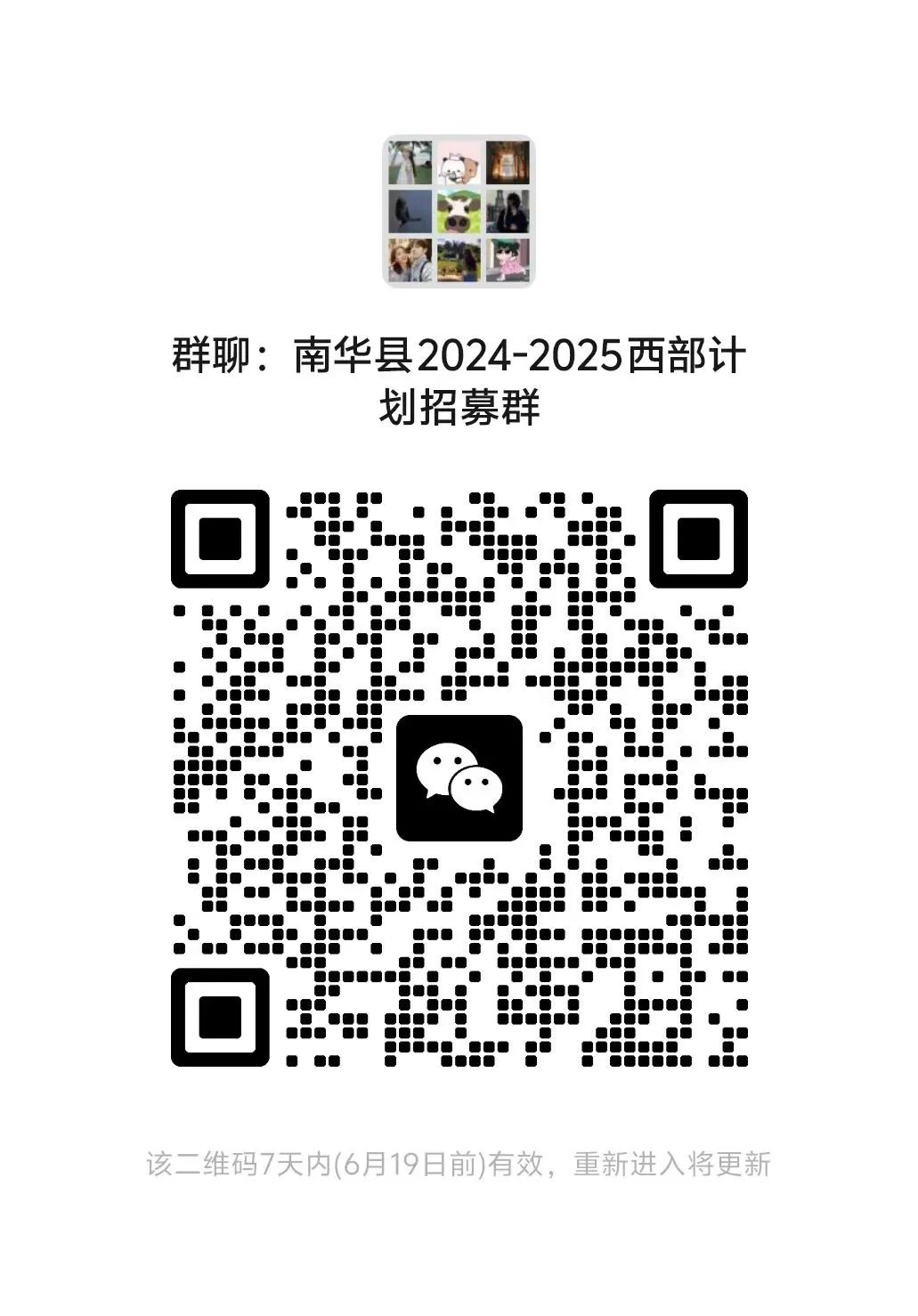 請(qǐng)通過(guò)報(bào)名審核的考生加入南華縣2024-2025西部計(jì)劃招募群,并修改備注:姓名+電話(huà)號(hào)碼。如果二維碼失效,無(wú)法加群,請(qǐng)及時(shí)聯(lián)系縣項(xiàng)目辦,電話(huà):0878-7222954。