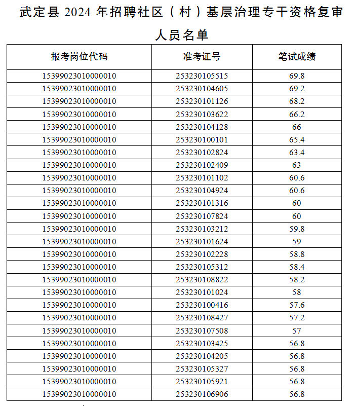 從達到云南省2024年社區(qū)(村)基層治理專干招聘考試筆試最低合格分?jǐn)?shù)線的考生中,按照筆試成績從高到低的順序,等額確定參加武定縣2024年社區(qū)(村)基層治理專干招聘資格復(fù)審人員。具體人員名單如下: