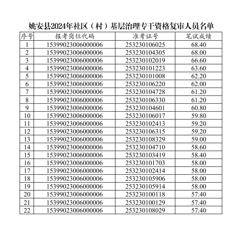 從達到云南省2024年社區(qū)(村)基層治理專干招聘筆試成績合格分數(shù)線以上人員中,按照成績從高到低的順序,等額確定進入資格復審人員名單。如最后一名考試成績并列的,一并進入資格復審。具體資格復審人員名單見附件。