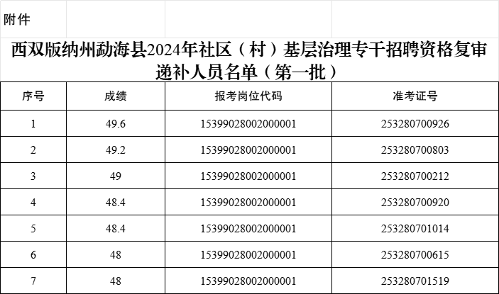 按照云南省2024年社區(qū)(村)基層治理專干招聘工作安排,因部分考生放棄或資格復(fù)審不合格,在筆試合格分數(shù)線以上考生中,按成績由高到低順序進行遞補?,F(xiàn)將西雙版納州勐海縣關(guān)于云南省2024年社區(qū)(村)基層治理專干招聘資格復(fù)審遞補人員名單(第一批)予以公示。
