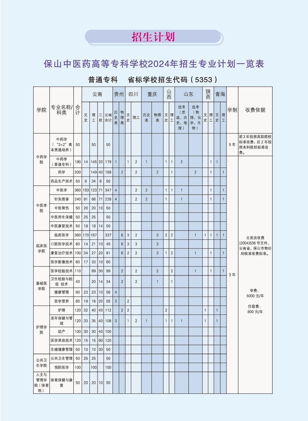 保山中醫(yī)藥高等??茖W(xué)校2024年招生計劃(普通??疲?/strong>