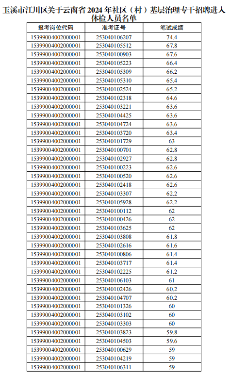 云南省2024年社區(qū)(村)基層治理專干招聘筆試、江川區(qū)資格復(fù)審工作已經(jīng)結(jié)束,根據(jù)《云南省2024年社區(qū)(村)基層治理專干招聘公告》有關(guān)規(guī)定,現(xiàn)將江川區(qū)進入體檢人員名單進行公布(詳見附件),并將體檢有關(guān)事宜通知如下: