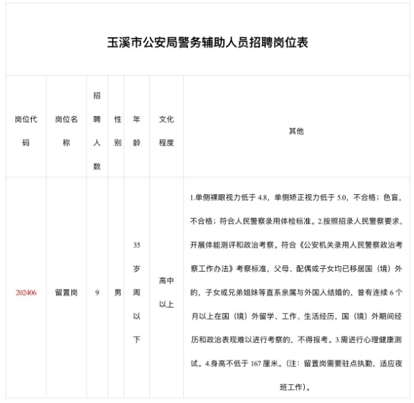 根據(jù)工作需要,面向社會公開招聘玉溪市公安局勤務(wù)輔警(具體崗位情況詳見附件),有關(guān)事項公告如下: