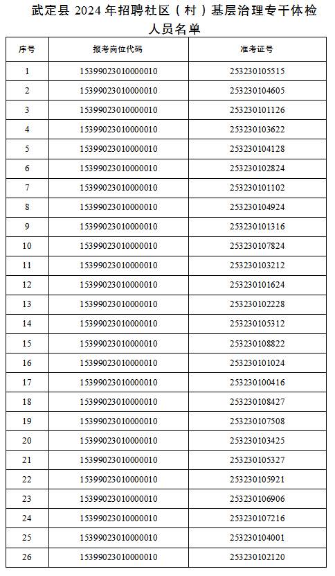 從達(dá)到云南省2024年社區(qū)(村)基層治理專干招聘資格復(fù)審合格且自愿參加體檢的考生中,等額確定參加武定縣2024年社區(qū)(村)基層治理專干招聘體檢人員。具體人員名單如下: