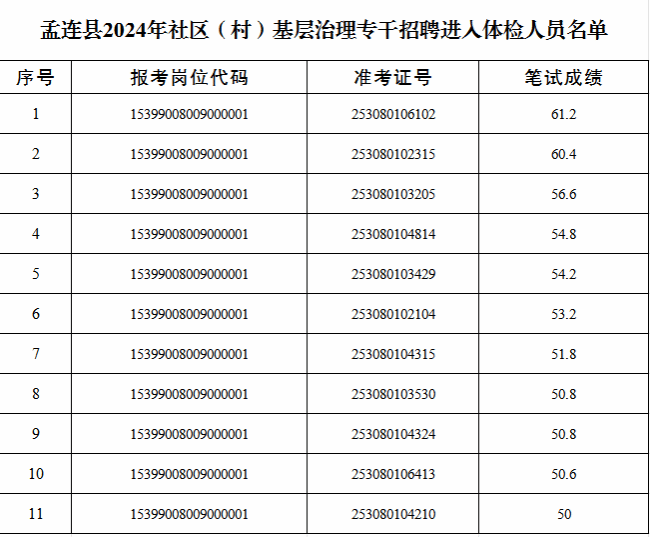 (三)參加體檢人員:報(bào)考孟連縣2024年社區(qū)(村)基層治理專干、符合《云南省2024年社區(qū)(村)基層治理專干招聘公告》規(guī)定的通過資格復(fù)審的人員。(詳見附件)