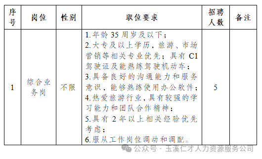 因公司發(fā)展需要,玉溪潤礎文旅投資發(fā)展有限責任公司委托玉溪仁才人力資源服務有限責任公司面向社會公開招聘勞務派遣工作人員5名,現(xiàn)將有關(guān)事宜公告如下: