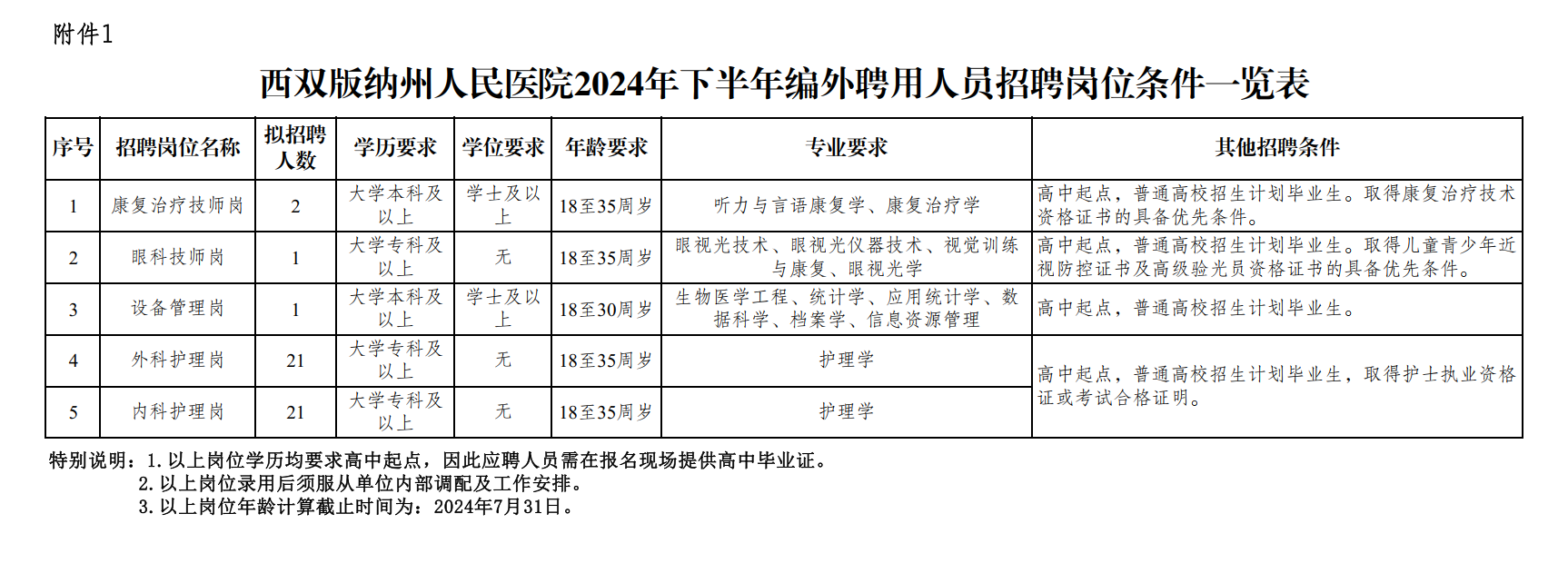 附件:1.西雙版納州人民醫(yī)院2024年下半年編外聘用人員招聘崗位條件一覽表