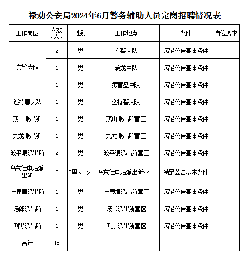 本次招聘為勞務派遣用工性質,共招聘15人,實行勞動合同制管理,崗位為祿勸彝族苗族自治縣公安局勤務輔警,不納入編制管理,不具有人民警察身份,不行使人民警察職權,主要負責協(xié)助公安民警開展治安巡邏、應急處突、非涉密性行政事務和公共服務管理等工作。具體招聘崗位需求見附件1《祿勸彝族苗族自治縣公安局2024年6月警務輔助人員定崗招聘情況表》。