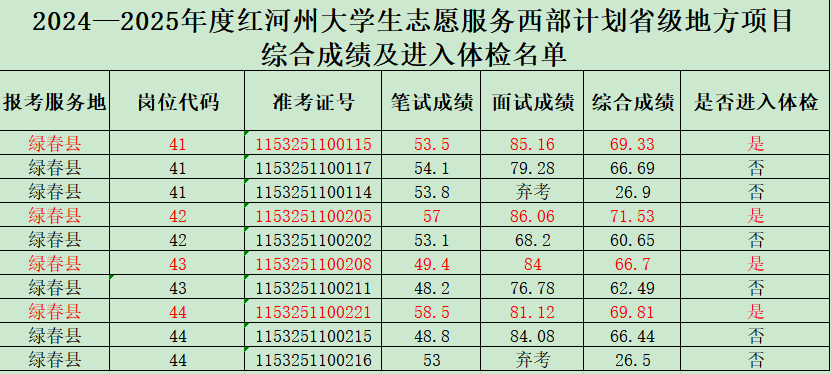根據(jù)《紅河州2024-2025年度大學(xué)生志愿服務(wù)西部計(jì)劃省級(jí)地方項(xiàng)目志愿者招募公告》文件要求,綠春縣項(xiàng)目辦已完成筆試、面試環(huán)節(jié),現(xiàn)將考生綜合成績及進(jìn)入體檢人員名單予以公示(見附件),公示期為3天(2024年6月28日-30日)。