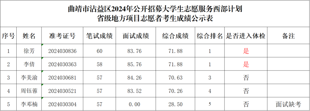 根據(jù)《關(guān)于做好2024—2025年度云南省大學生志愿服務西部計劃地方項目志愿者招募派遣工作的通知》精神及《2024年西部計劃云南省地方項目志愿者招募公告》《云南省曲靖市關(guān)于2024年大學生志愿服務西部計劃地方項目志愿者招募的公告》有關(guān)規(guī)定和要求,曲靖市沾益區(qū)項目辦于2024年6月28日上午組織了大學生志愿服務西部計劃省級地方項目志愿者面試,現(xiàn)將曲靖市沾益區(qū)2024年招募大學生志愿服務西部計劃省級地方項目志愿者面試成績、綜合成績及擬進入體檢人員名單進行公示。