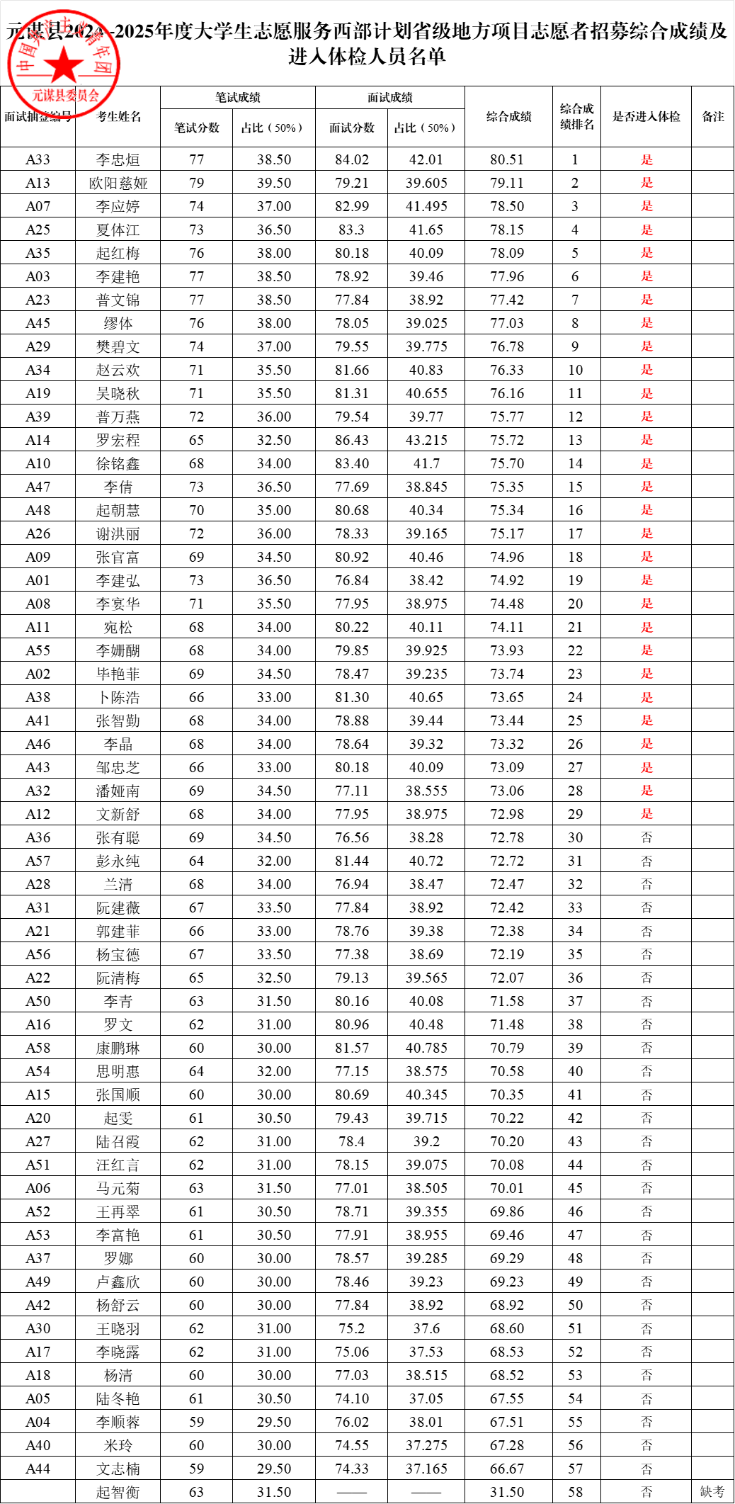 根據(jù)共青團云南省委、云南省教育廳、云南省財政廳、云南省人力資源和社會保障廳《關(guān)于印發(fā)〈2024—2025年度云南省大學生志愿服務(wù)西部計劃實施方案〉的通知》和云南省大學生志愿服務(wù)西部計劃項目管理辦公室《關(guān)于做好2024—2025年度云南省大學生志愿服務(wù)西部計劃地方項目志愿者招募派遣工作的通知》要求,元謀縣2024—2025年度大學生志愿服務(wù)西部計劃地方項目志愿者招募考試工作已經(jīng)結(jié)束,各報考人員綜合成績的計算方法是:綜合成績=筆試成績×50%+面試成績×50%。筆試、面試均采取百分制計分,綜合成績保留小數(shù)點后2位。經(jīng)核準,本次面試共有6名考生自愿放棄,按照不低于1:2的面試比例要求,依次遞補2名考生參加面試,共有58名考生參加面試,現(xiàn)將元謀縣2024—2025年度西部計劃大學生志愿服務(wù)省級地方項目志愿者考試綜合成績排名及擬進入體檢人員有關(guān)事項公告如下:
