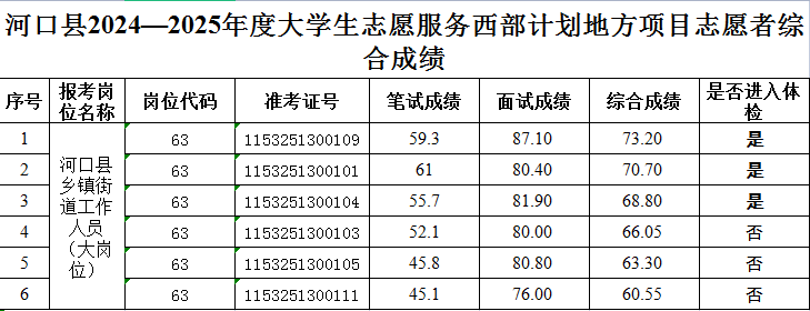 根據(jù)《紅河州2024—2025年度大學(xué)生志愿服務(wù)西部計劃地方項目志愿者招募公告》工作安排,共青團河口縣委于2024年6月28日順利完成大學(xué)生志愿者面試招募工作。此次面試遵循公平、公正、公開的原則,堅決把規(guī)矩和紀(jì)律放在首位,從報名及資格審查、筆試、面試等環(huán)節(jié)都嚴(yán)格把關(guān),科學(xué)制定面試實施方案?,F(xiàn)將綜合成績及體檢名單公示如下:
