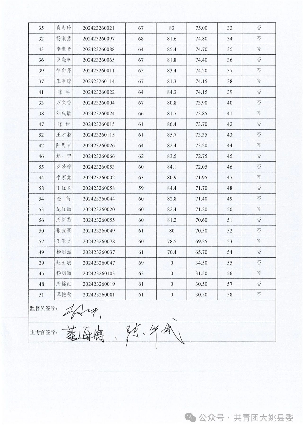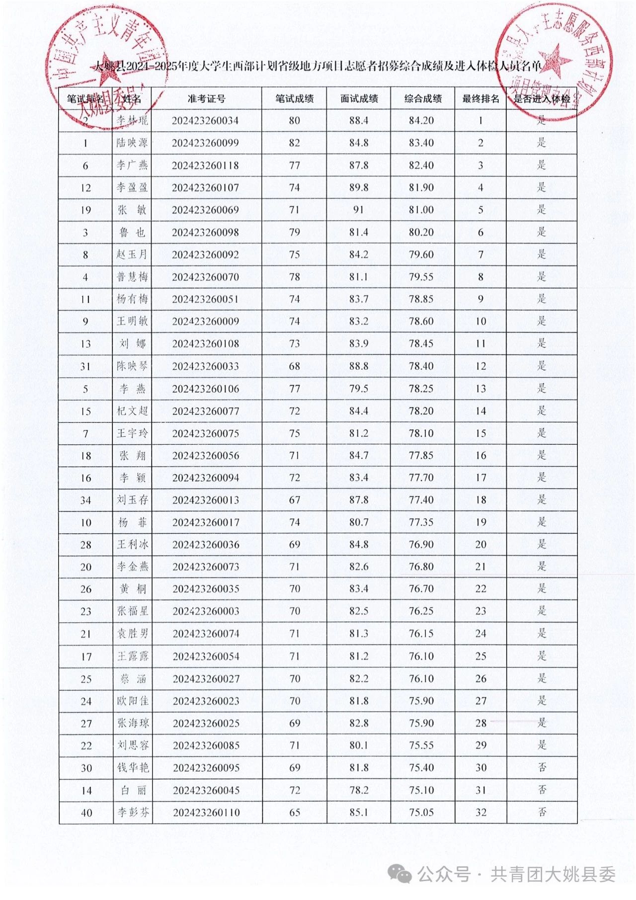 大姚縣2024—2025年度大學(xué)生志愿服務(wù)西部計劃地方項目招募擬進入體檢人員名單根據(jù)報考者綜合成績從高到低順序,擬確定前29名進入體檢,名單詳見下圖。