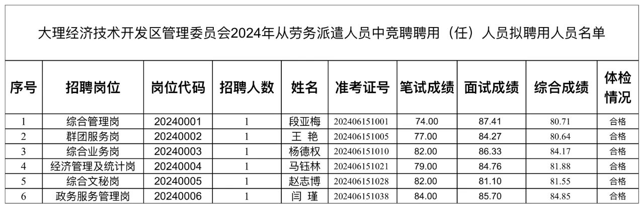 根據(jù)《關于開展2024年從勞務派遣人員中競聘聘用(任)人員工作的通知》規(guī)定,段亞梅等6名同志體檢合格,現(xiàn)將大理經(jīng)濟技術開發(fā)區(qū)管理委員會2024年從勞務派遣人員中競聘聘用(任)人員擬聘用人員予以公示。