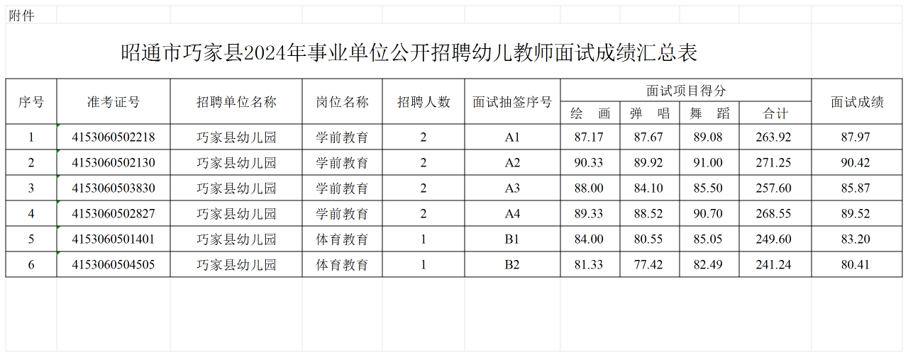根據(jù)《昭通市2024年事業(yè)單位公開招聘工作人員通告(第一號)》《昭通市2024年事業(yè)單位公開招聘幼兒教師面試通告》,昭通市巧家縣2024年事業(yè)單位公開招聘幼兒教師面試工作已完成,現(xiàn)將面試成績公示如下。公示時間為3個工作日,若有異議,請聯(lián)系巧家縣教育體育局人事股,聯(lián)系電話:0870-7127016。