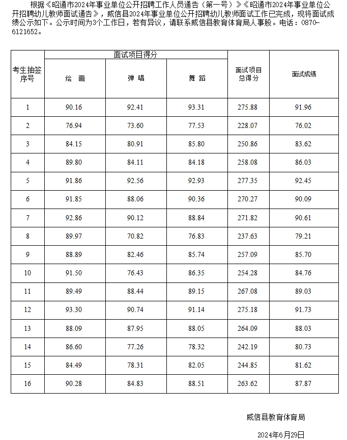 威信縣2024年事業(yè)單位公開(kāi)招聘幼兒教師面試成績(jī)公示