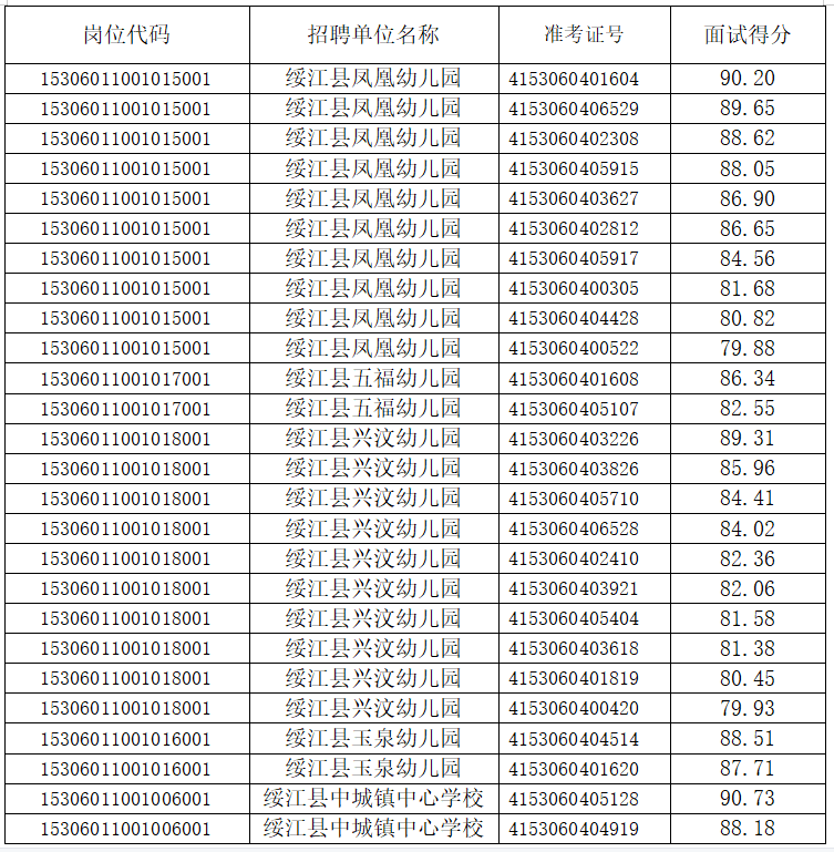 綏江縣2024年事業(yè)單位公開招聘幼兒教師面試成績通告 根據(jù)《昭通市2024年事業(yè)單位公開招聘工作人員通告(第一號)》和《昭通市2024年事業(yè)單位公開招聘幼兒教師面試通告》,現(xiàn)將綏江縣2024年事業(yè)單位公開招聘幼兒教師面試成績通告如下: