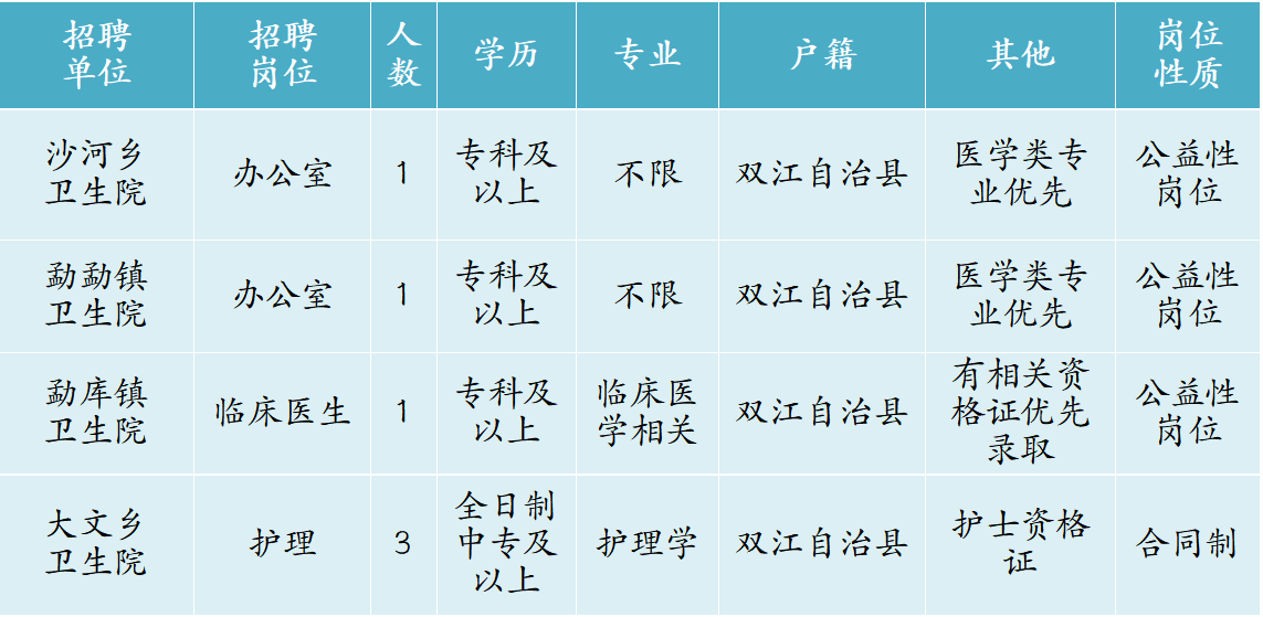 根據(jù)工作需要,雙江自治縣醫(yī)共體總醫(yī)院面向社會公開招聘編制外合同制工作人員及公益性崗位工作人員,現(xiàn)將相關(guān)事項公告如下: