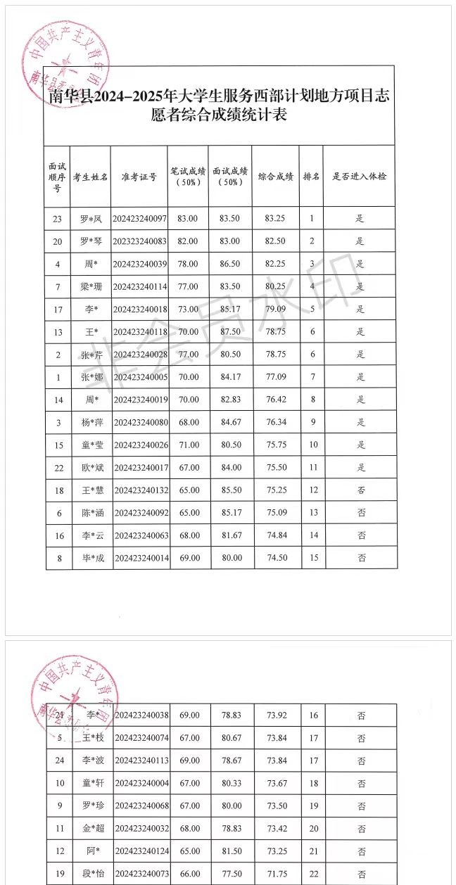 根據(jù)《共青團云南省委、云南省教育廳、云南省財政廳、云南省人力資源和社會保障廳關(guān)于印發(fā)〈2024-2025年度云南省大學(xué)生志愿服務(wù)西部計劃實施方案〉的通知》(云青聯(lián)〔2024〕11號)和《楚雄州2024—2025年度大學(xué)生志愿服務(wù)西部計劃地方項目招募工作實施方案》有關(guān)要求,2024年6月30日,南華縣西部計劃項目辦公室組織開展了2024—2025年度大學(xué)生志愿服務(wù)西部計劃地方項目面試工作,現(xiàn)將綜合成績排名及擬進入體檢人員有關(guān)事項公告如下: