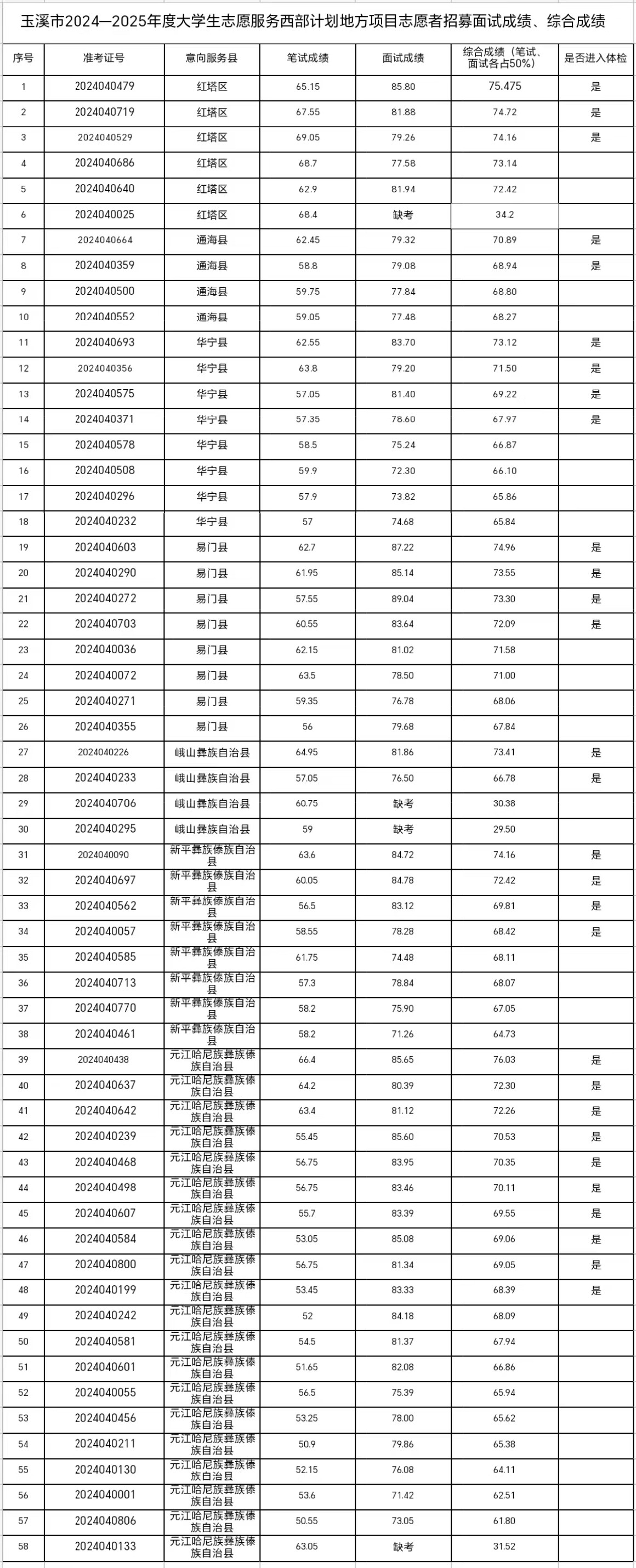 附件:玉溪市2024—2025年度大學(xué)生志愿服務(wù)西部計劃地方項目志愿者招募面試成績、綜合成績