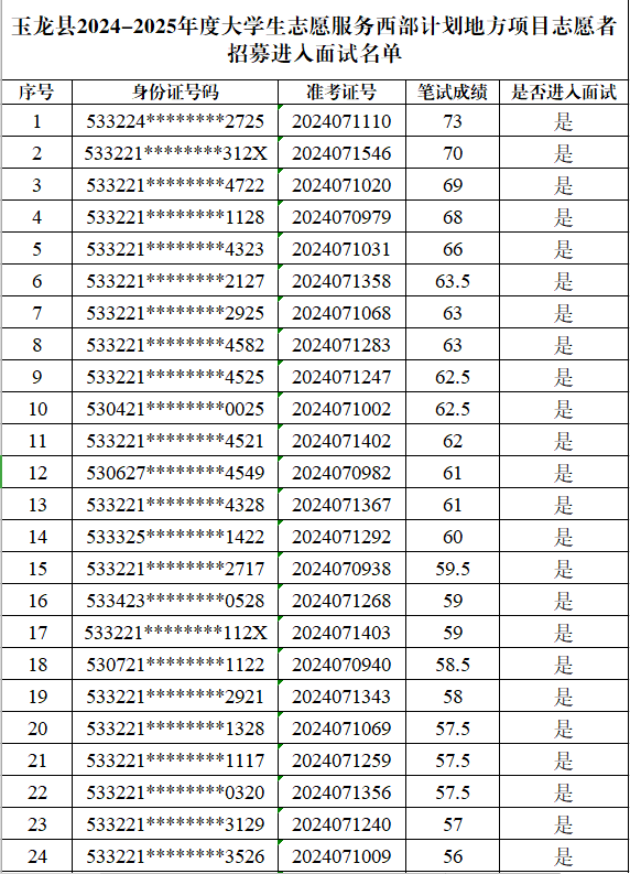 附件:玉龍縣2024—2025年度大學生志愿服務(wù)西部計劃地方項目招募進入面試名單