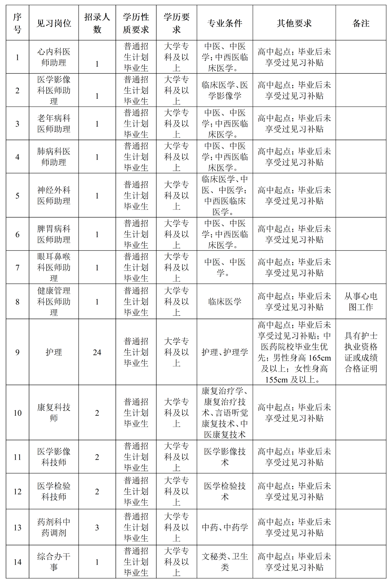 為了積極推進(jìn)我縣高校畢業(yè)生就業(yè)見(jiàn)習(xí)工作,培養(yǎng)優(yōu)秀的衛(wèi)生專(zhuān)業(yè)技術(shù)人才,醫(yī)院計(jì)劃面向社會(huì)招錄42名見(jiàn)習(xí)人員,分別是醫(yī)師助理8人、護(hù)士24人、康復(fù)2人、影像2人、檢驗(yàn)2人、中藥3人、綜合辦干事1人,具體如下: