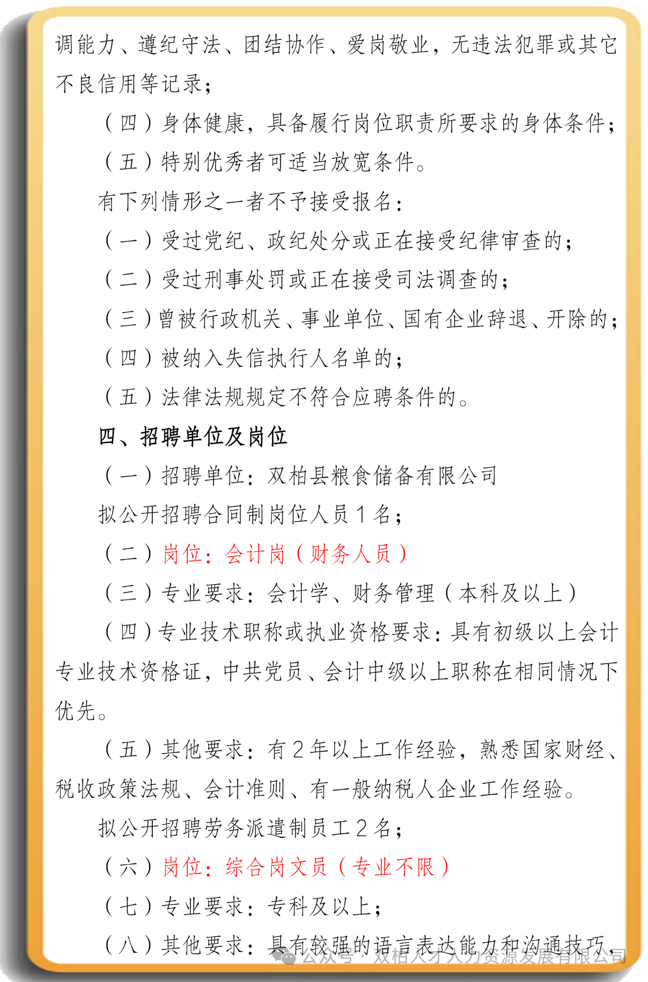 雙柏縣糧食儲備有限公司公開招聘崗位人員公告