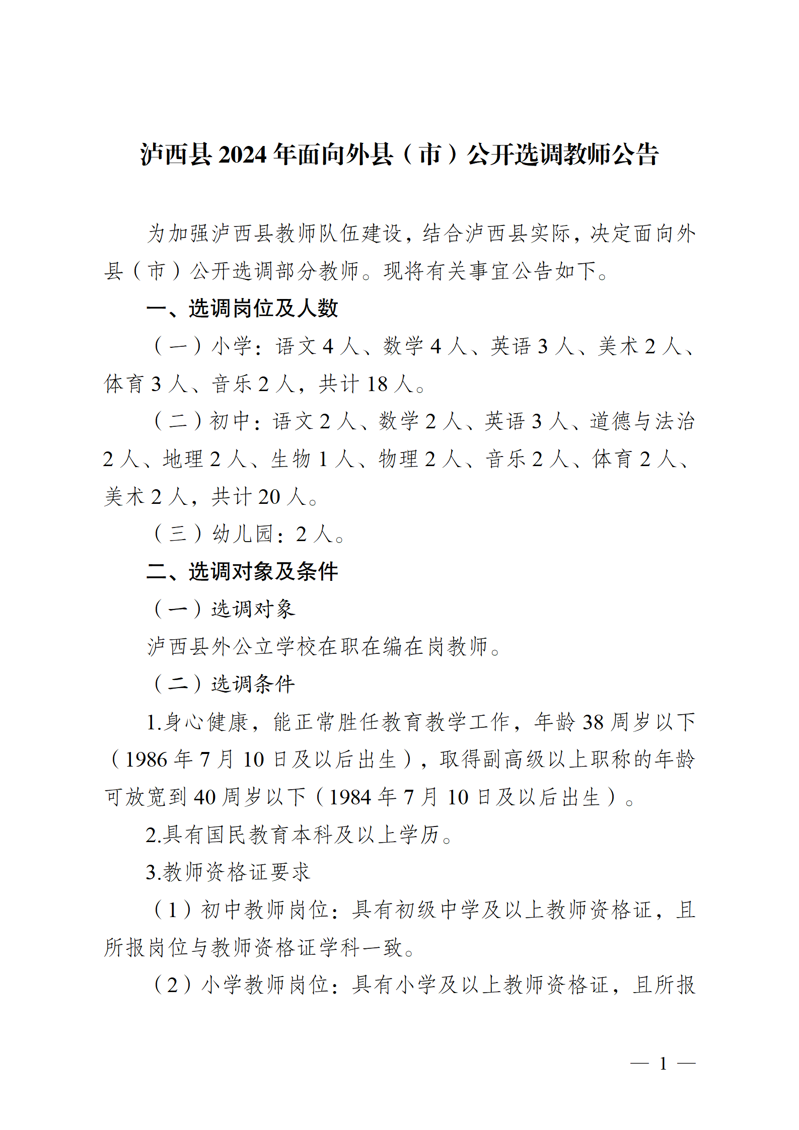 瀘西縣2024年面向外縣(市)公開選調(diào)教師公告