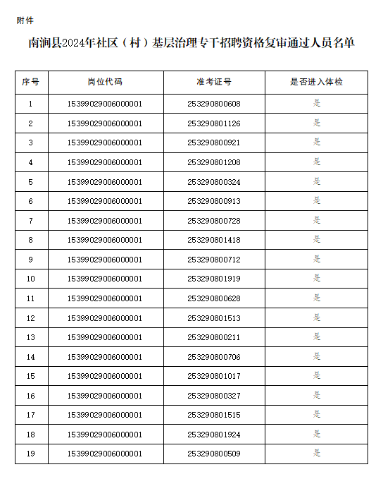 附件:南澗縣2024年社區(qū)(村)基層治理專干招聘資格復審通過人員名單