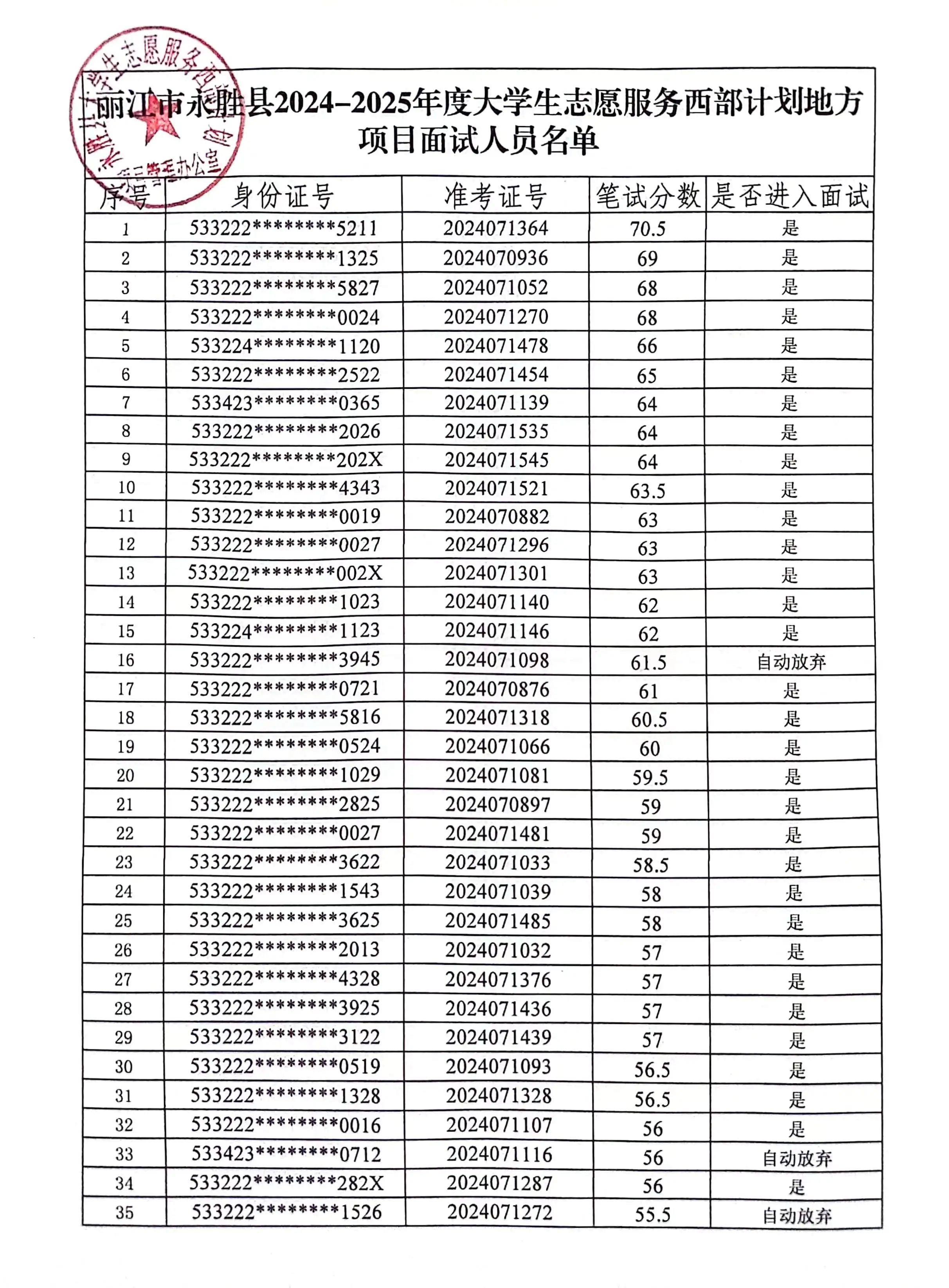 根據(jù)麗江市西部計劃項目辦關(guān)于開展2024-2025年度云南省大學(xué)生志愿服務(wù)西部計劃省級地方項目的有關(guān)要求,按報考崗位根據(jù)筆試成績從高到低的順序,以招考計劃數(shù)1:2的比例,確定參加面試人選,現(xiàn)將面試有關(guān)事項公告如下: