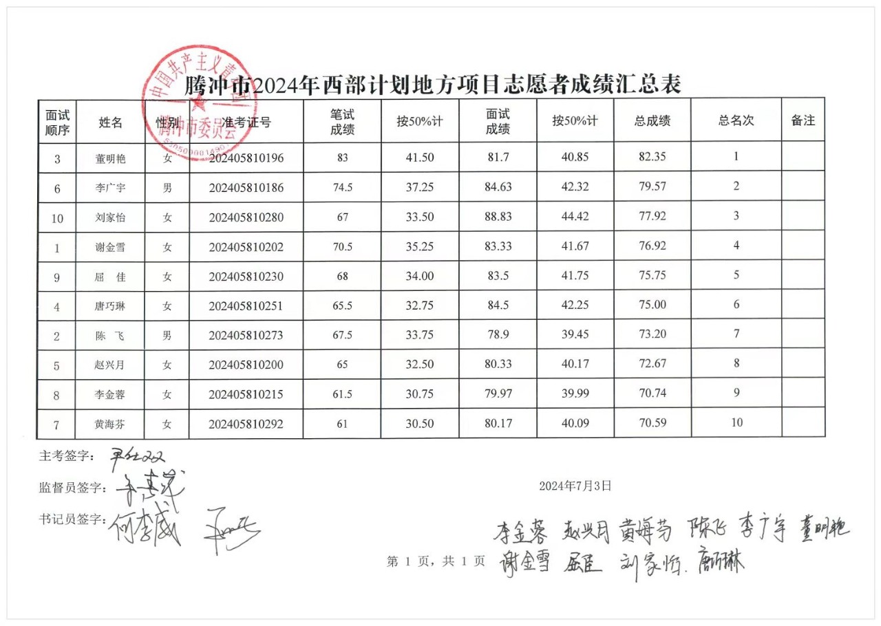 根據(jù)考生筆試成績(jī)從高分到低分的順序按照騰沖市崗位計(jì)劃數(shù)與面試人數(shù)1︰2的比例確定擬面試人員,分?jǐn)?shù)相等考生并列進(jìn)入面試。7月3日,騰沖市2024—2025年度大學(xué)生志愿服務(wù)西部計(jì)劃省級(jí)地方項(xiàng)目志愿者招募面試采用結(jié)構(gòu)化的方式進(jìn)行,并圓滿結(jié)束,現(xiàn)將面試及綜合成績(jī)予以公示。
