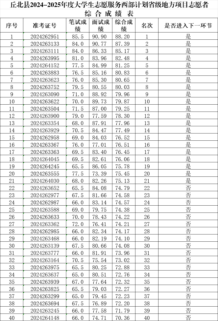根據(jù)丘北縣2024—2025年度大學(xué)生志愿服務(wù)西部計(jì)劃省級(jí)地方項(xiàng)目志愿者招募程序和《關(guān)于做好2024—2025年度云南省大學(xué)生志愿者服務(wù)西部計(jì)劃地方項(xiàng)目志愿者招募派遣工作的通知》《關(guān)于做好文山州2024—2025年度西部計(jì)劃省級(jí)地方項(xiàng)目志愿者招募工作的通知》相關(guān)要求,丘北縣項(xiàng)目辦于2024年7月3日組織開展面試,現(xiàn)將丘北縣2024年招募大學(xué)生志愿服務(wù)西部計(jì)劃省級(jí)地方項(xiàng)目志愿者綜合成績(jī)進(jìn)行公示。