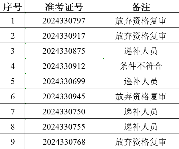 根據(jù)怒江州大學(xué)生志愿服務(wù)西部計(jì)劃項(xiàng)目管理辦公室關(guān)于做好怒江新招募大學(xué)生志愿服務(wù)西部計(jì)劃省級(jí)地方項(xiàng)目志愿者面試及后續(xù)錄用工作的要求,對(duì)瀘水市2024—2025年度大學(xué)生志愿服務(wù)西部計(jì)劃地方項(xiàng)目招募資格復(fù)審期間,因考生放棄等原因出現(xiàn)缺額,擬從報(bào)考瀘水崗位的考生中,按筆試成績從高到低的順序依次遞補(bǔ)參加資格復(fù)審確認(rèn)?,F(xiàn)將遞補(bǔ)人員名單公布如下: