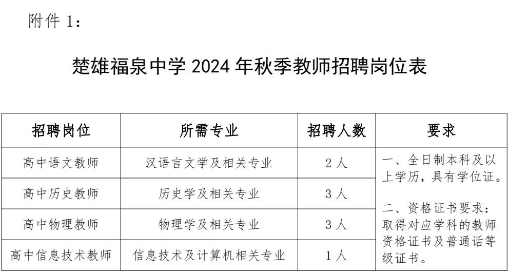 楚雄福泉中學(xué)2024年秋季教師招聘公告