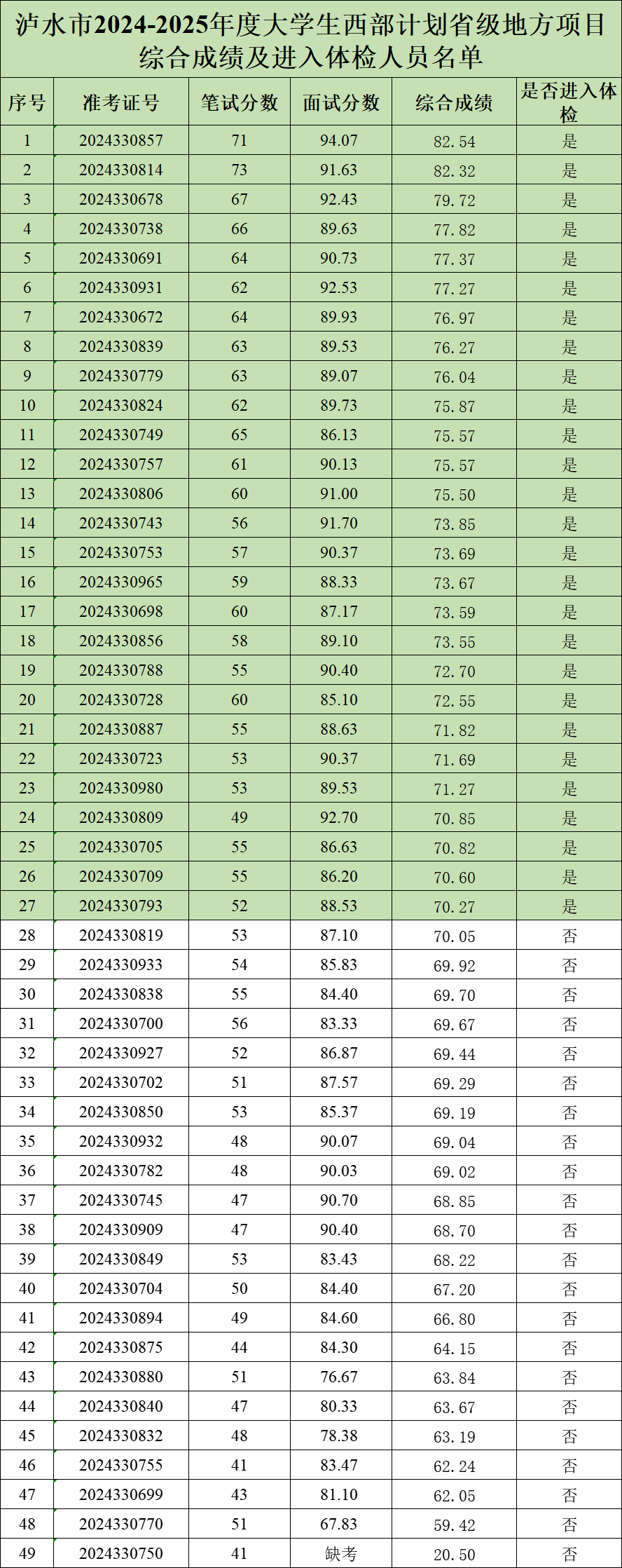 根據(jù)綜合成績從高到低的順序,排名前27名考生進入體檢階段。擬體檢人員未在規(guī)定時間內(nèi)參加體檢、體檢不合格或個人放棄等情況出現(xiàn)崗位空缺的,按綜合成績從高到低順延遞補。
