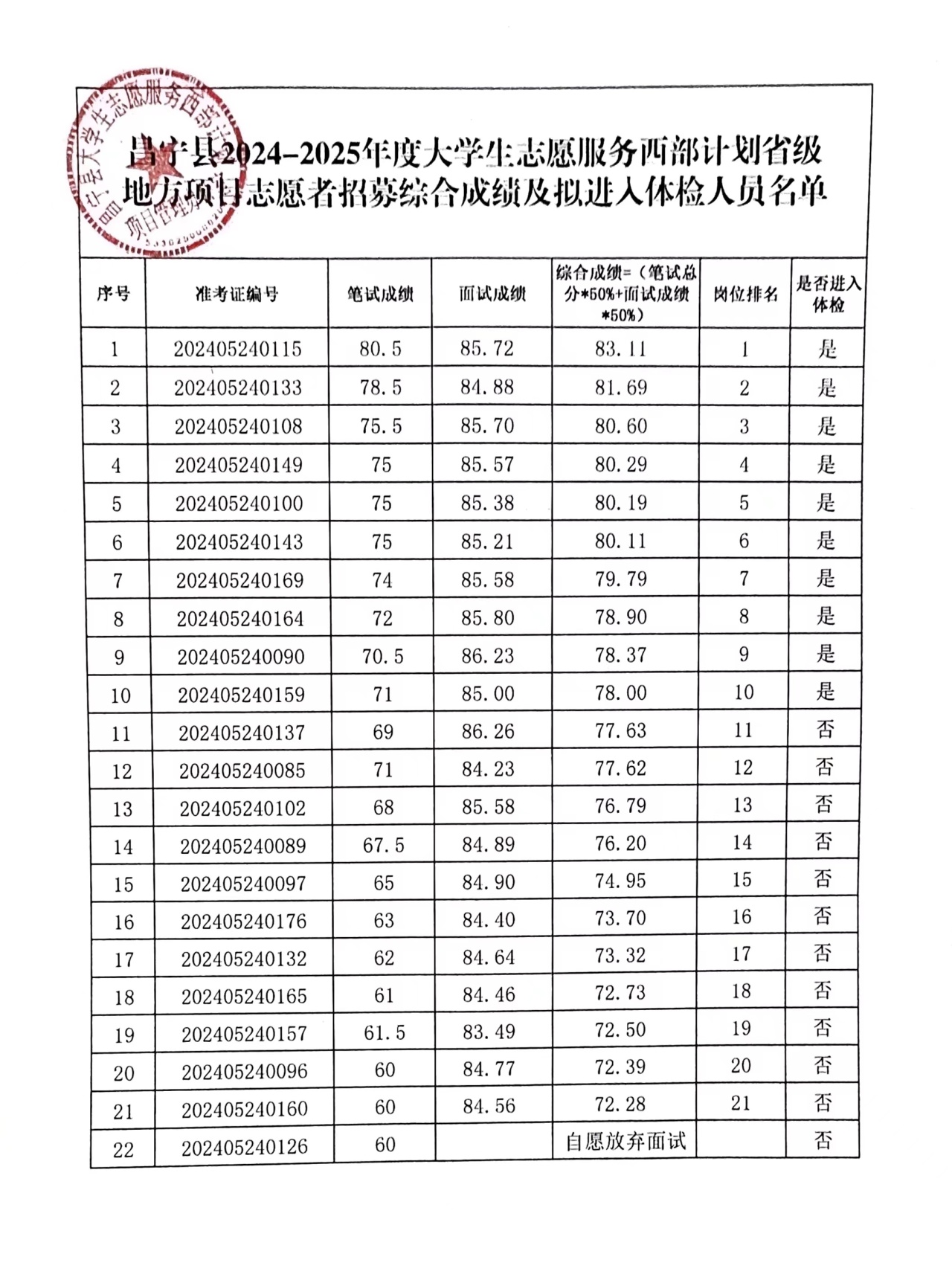 根據(jù)昌寧縣2024—2025年度大學生志愿服務西部計劃省級地方項目志愿者招募工作安排。7月4日,昌寧縣項目辦統(tǒng)一組織面試,根據(jù)考生筆試成績從高分到低分的順序按照崗位1︰2的比例確定面試人員,經(jīng)過補錄共22人進入面試,棄考1人,實際參加面試21人?,F(xiàn)將綜合成績及擬進入體檢人員名單予以公示。