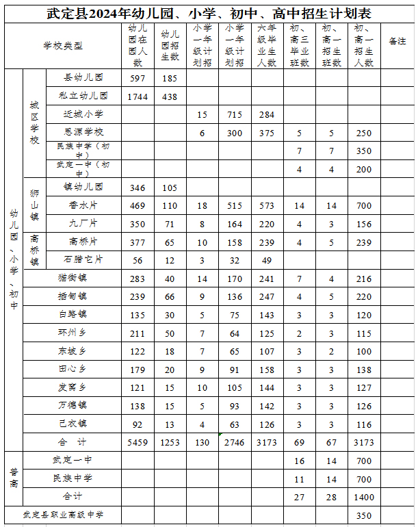 武定縣2024年幼兒園、小學(xué)、初中、高中招生計(jì)劃