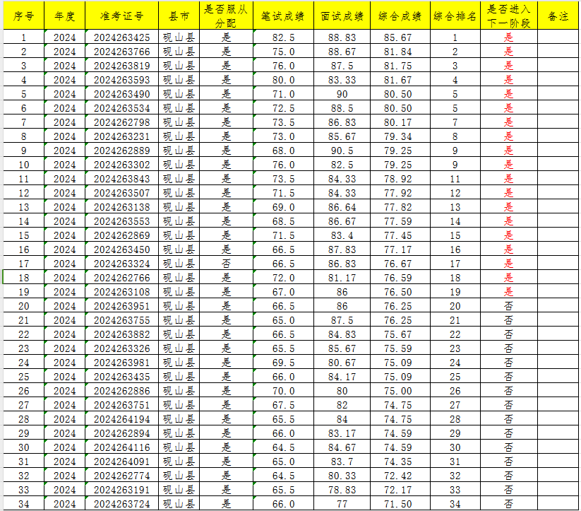 根據(jù)硯山縣2024—2025年度大學(xué)生志愿服務(wù)西部計劃省級地方項目志愿者招募程序和《關(guān)于做好2024—2025年度云南省大學(xué)生志愿者服務(wù)西部計劃地方項目志愿者招募派遣工作的通知》、《關(guān)于做好文山州2024-2025年度西部計劃省級地方項目志愿者招募工作的通知》文件要求,硯山縣大學(xué)生西部計劃項目管理辦公室已于7月4日舉行了公開面試,現(xiàn)將招募人員筆試成績、面試成績、綜合成績(筆試成績×50%+面試成績×50%,面試、綜合成績通過計算四舍五入保留兩位小數(shù)。)公示如下(公示時間為2024年7月5日-2023年7月9日):