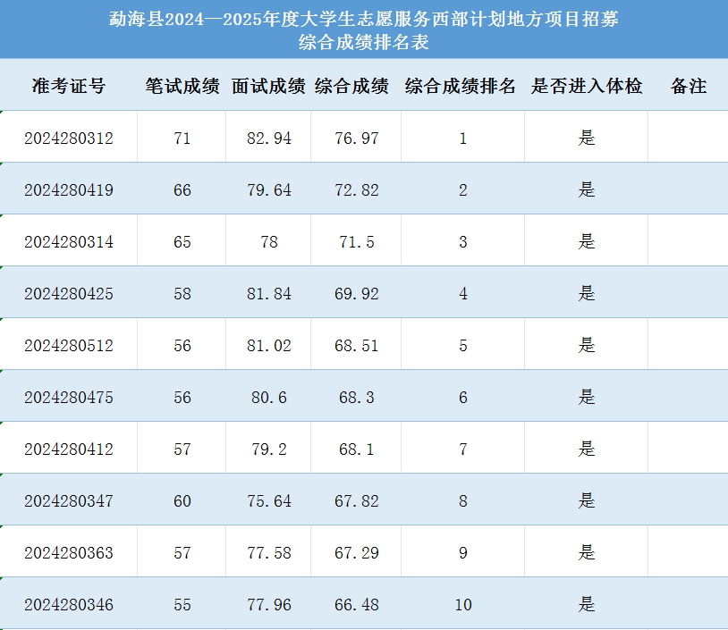 勐??h2024—2025年度大學(xué)生志愿服務(wù)西部計劃地方項目招募擬進入體檢人員名單根據(jù)報考者綜合成績從高到低的順序,按招募崗位1:1的比例來確定(綜合成績計算方法:綜合成績=筆試成績50%+面試成績50%)。名單如下: