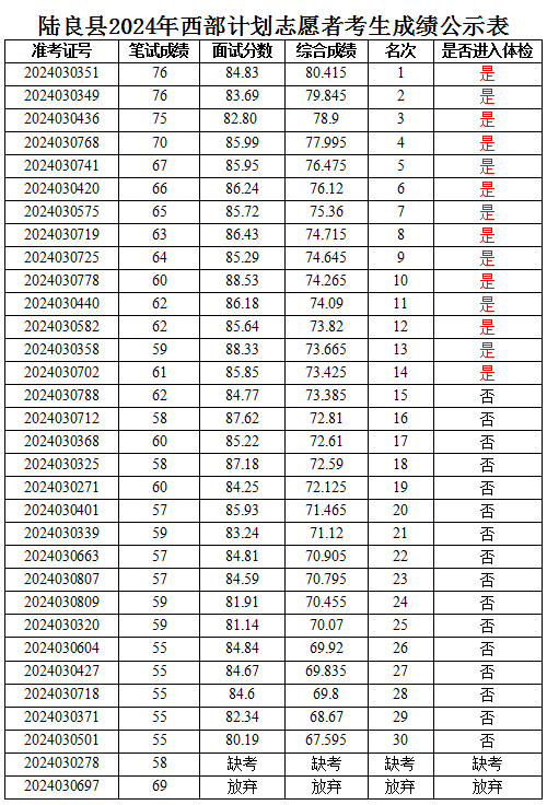 陸良縣項目辦將組織綜合成績排名前14名考生參加體檢等后續(xù)工作。請進入體檢環(huán)節(jié)的考生近幾天注意飲食清淡,須空腹體檢。具體體檢時間、地點等內(nèi)容將由陸良縣項目辦工作人員電話通知至本人,請考生持續(xù)關注微信公眾號“青春陸良”,并保持電話暢通。如有考生放棄,將按綜合成績排名依次遞補。