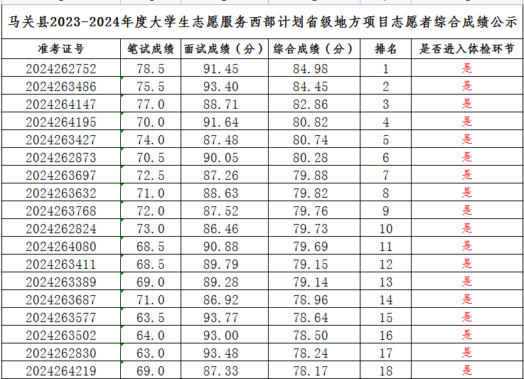 根據(jù)馬關(guān)縣2024—2025年度大學(xué)生志愿服務(wù)西部計(jì)劃省級(jí)地方項(xiàng)目志愿者招募程序和《關(guān)于做好2024—2025年度云南省大學(xué)生志愿者服務(wù)西部計(jì)劃地方項(xiàng)目志愿者招募派遣工作的通知》《關(guān)于做好文山州2024—2025年度西部計(jì)劃省級(jí)地方項(xiàng)目志愿者招募工作的通知》文件要求,馬關(guān)縣大學(xué)生志愿服務(wù)西部計(jì)劃項(xiàng)目管理辦公室已于2024年7月4日舉行了面試,現(xiàn)將參加面試人員綜合成績公示如下,公示時(shí)間為三個(gè)工作日(2024年7月5日—7月9日):