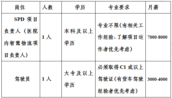 SPD項目負(fù)責(zé)人:1.物流及相關(guān)專業(yè)??萍耙陨蠈W(xué)歷;2..醫(yī)藥或醫(yī)療器械物流管理工作經(jīng)驗(yàn);3.熟悉醫(yī)院器械產(chǎn)品或藥品作業(yè)流程優(yōu)先考慮。4.具有一定的項目管理能力,能做好項目整體規(guī)劃和管理。