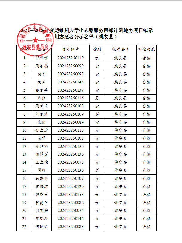 姚安縣2024—2025年度大學生志愿服務(wù)西部計劃省級地方項目擬錄用志愿者名單公示!
