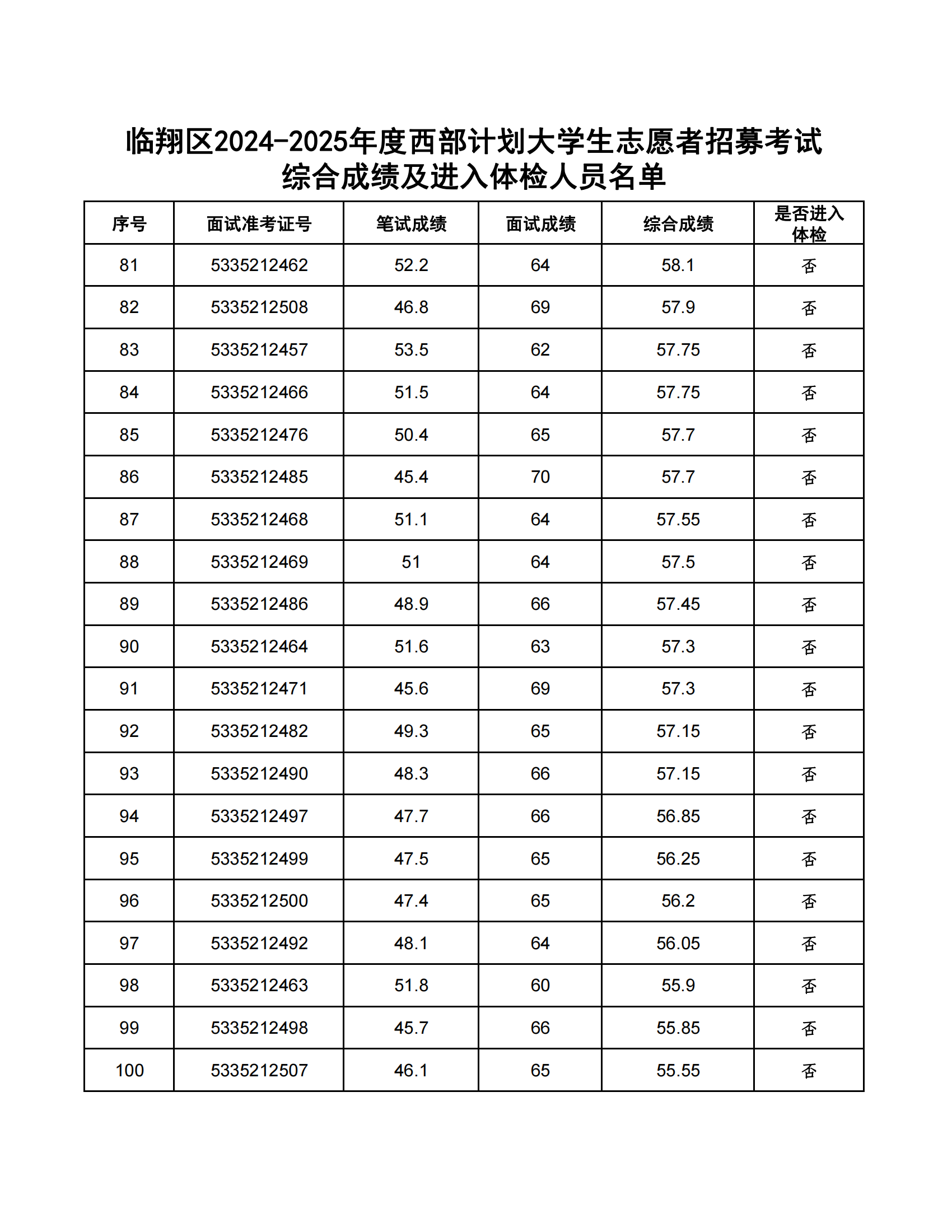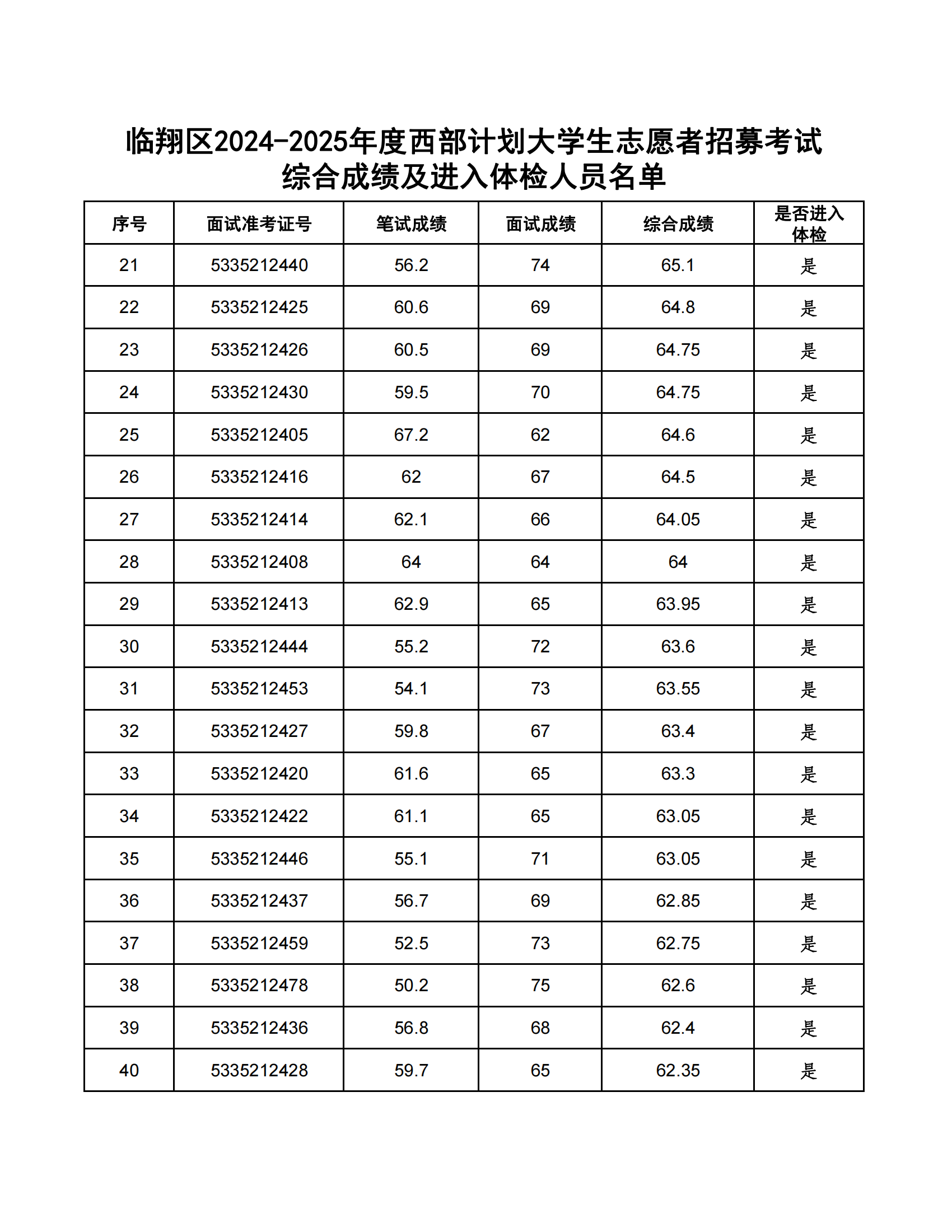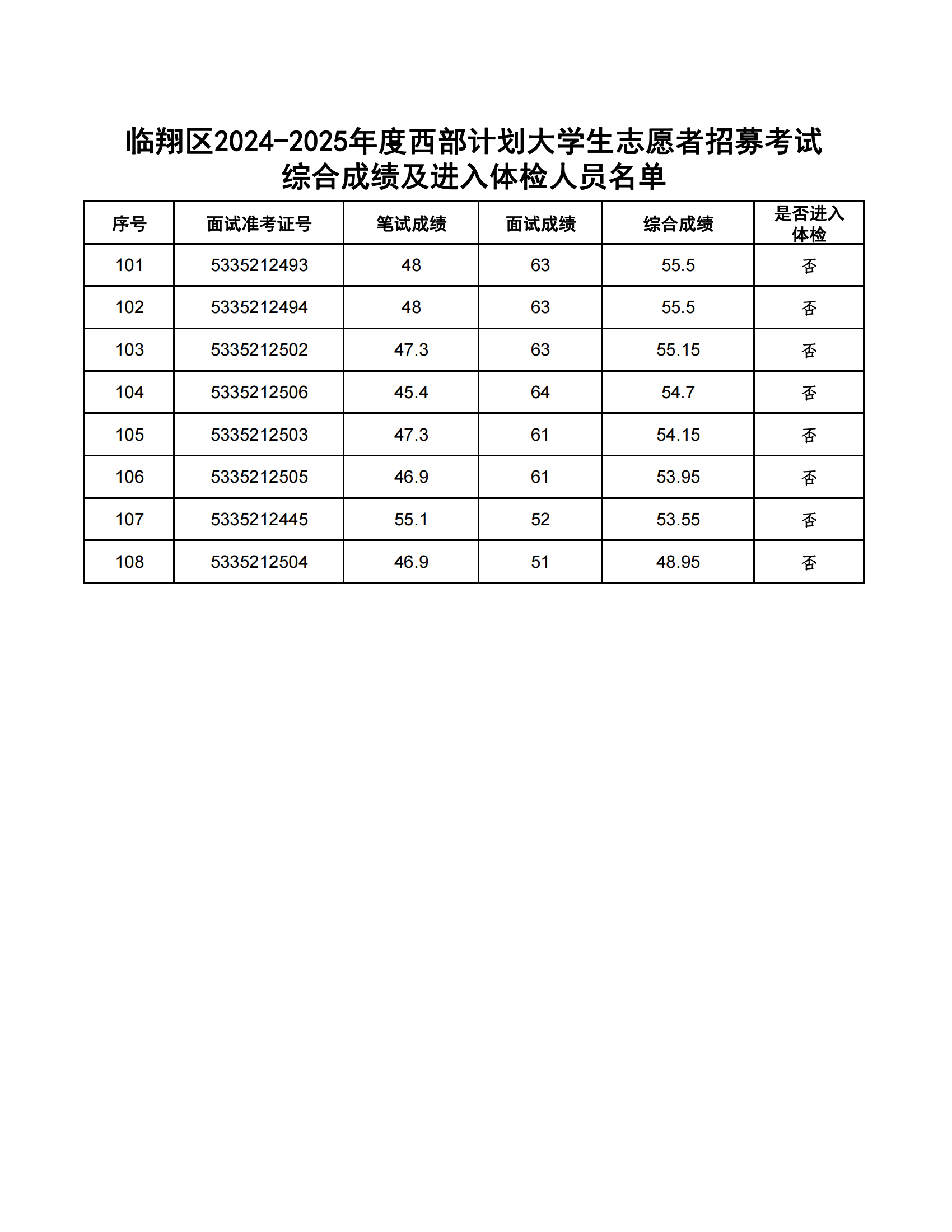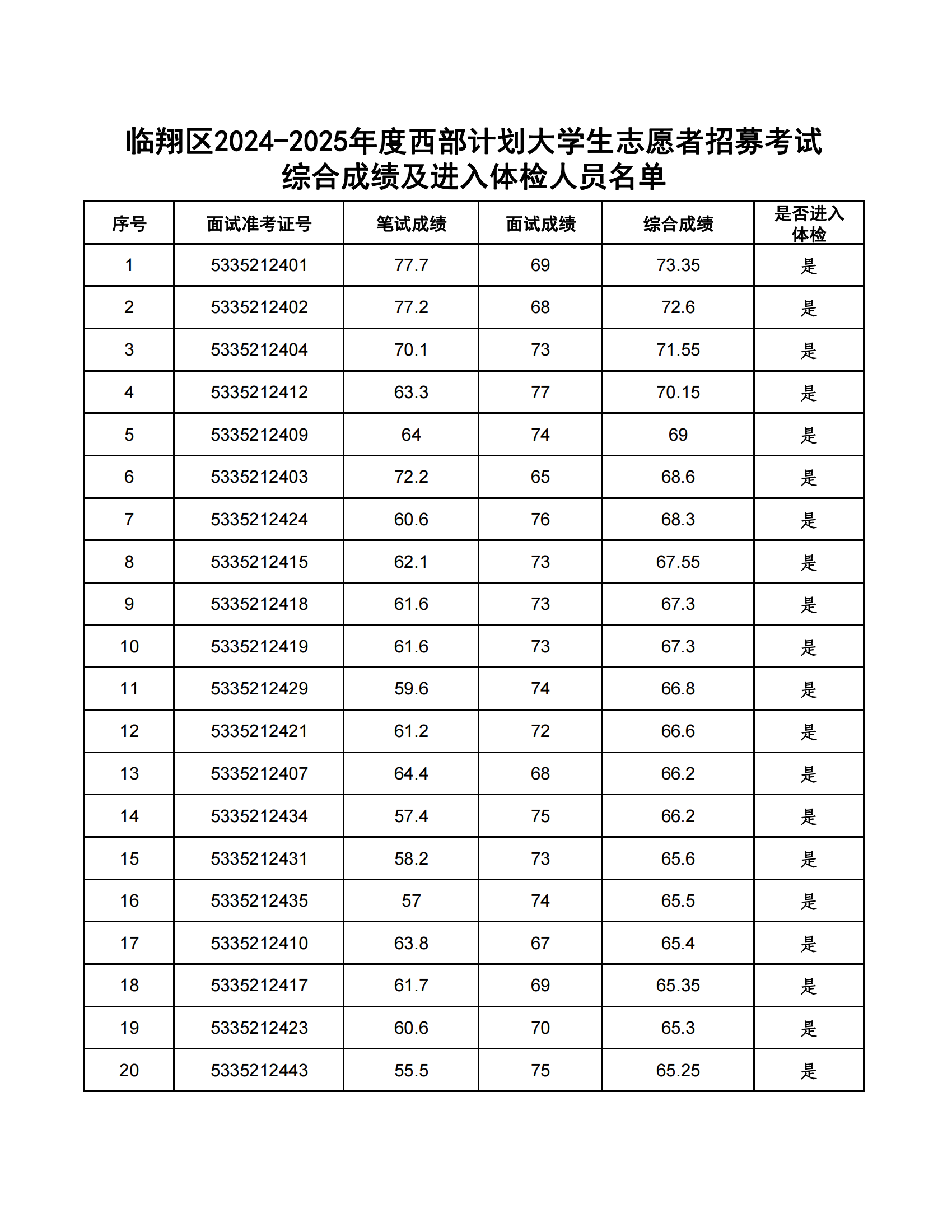 臨翔區(qū)2024-2025年度大學(xué)生志愿服務(wù)西部計劃省級地方項目志愿者計劃招募54人。根據(jù)《臨翔區(qū)2024-2025年度西部計劃志愿者招募公告》,經(jīng)報名、資格審核、筆試等程序,共有108人進(jìn)入復(fù)試?,F(xiàn)將綜合成績公告如下:(綜合成績=筆試成績×50%+復(fù)試成績×50%),綜合成績并列的,以筆試成績高者優(yōu)先。