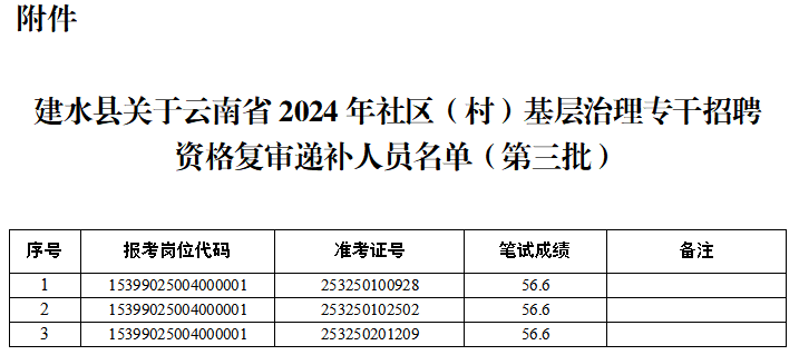 附件:建水縣關(guān)于云南省2024年社區(qū)(村)基層治理專干招聘資格復(fù)審遞補(bǔ)人員名單(第三批)