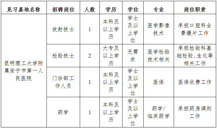 昆明理工大學(xué)附屬安寧市第一人民醫(yī)院高校畢業(yè)生就業(yè)見習(xí)崗位招聘啟事